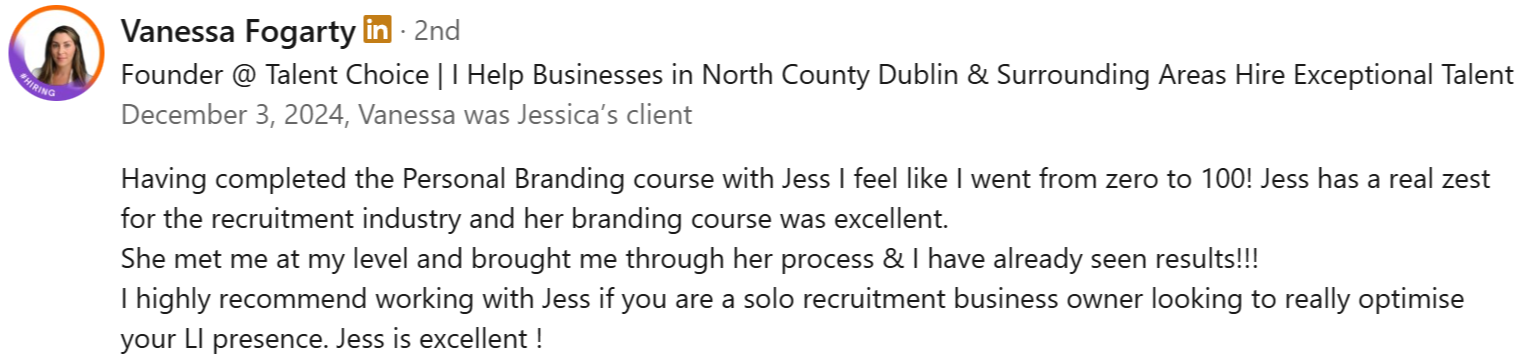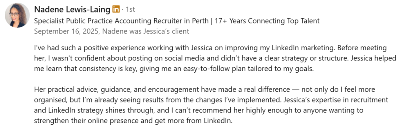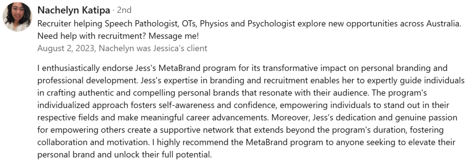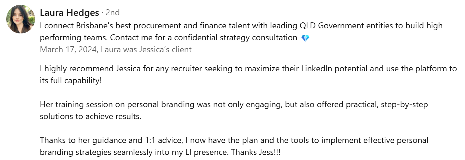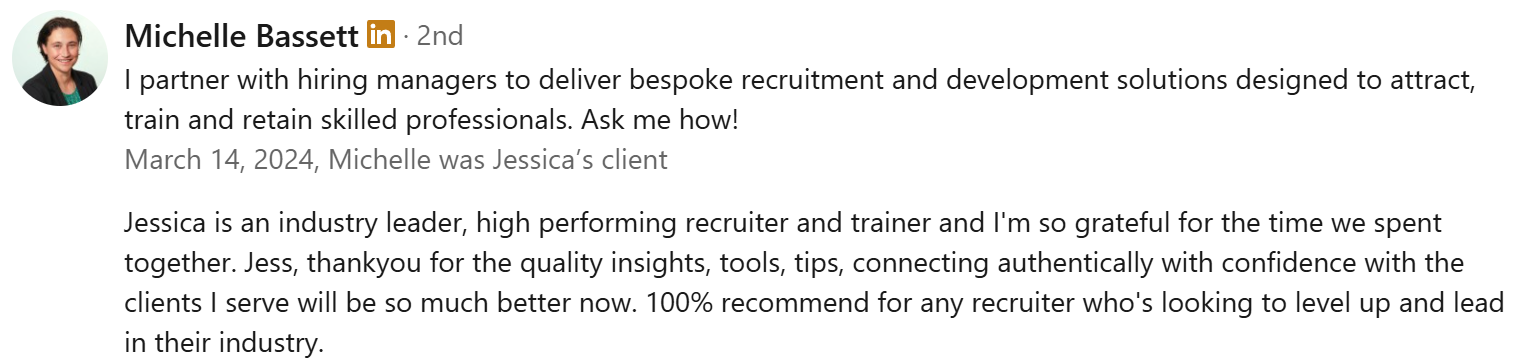 Natalie already had 20 years recruitment experience but came to us for direction and strategy. Within two months of completing our program, she activated 10 clients in her network, brought in 6-figures worth of jobs, and had over 200 candidates register. In her third month after completing, she had five $120,000+ jobs called in within one fortnight. This added an additional 6-figures to her billings that quarter alone. Nat has since had multiple viral posts, built a highly consistent pipeline and flow of leads, and has even launched in-person events!